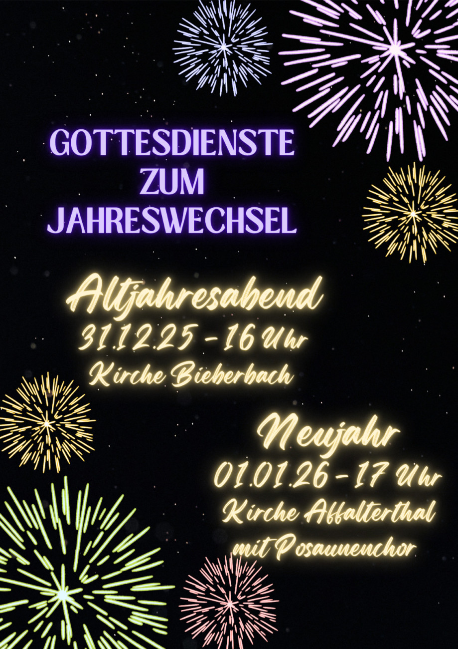 Wir lassen das alte Jahr ausklingen und starten mit frischen Mut in das neue Jahr! Herzliche Einladung zu unseren Gottesdiensten zum Jahreswechsel! Mittwoch, 31.12.2025, 16:00 Uhr Reformationsgedächtniskirche Bieberbach Donnerstag, 01.01.2026, 17:00 Uhr Dorfkirche Affalterthal Weiterlesen über Wir lassen das alte Jahr ausklingen und starten mit frischen Mut in das neue Jahr!